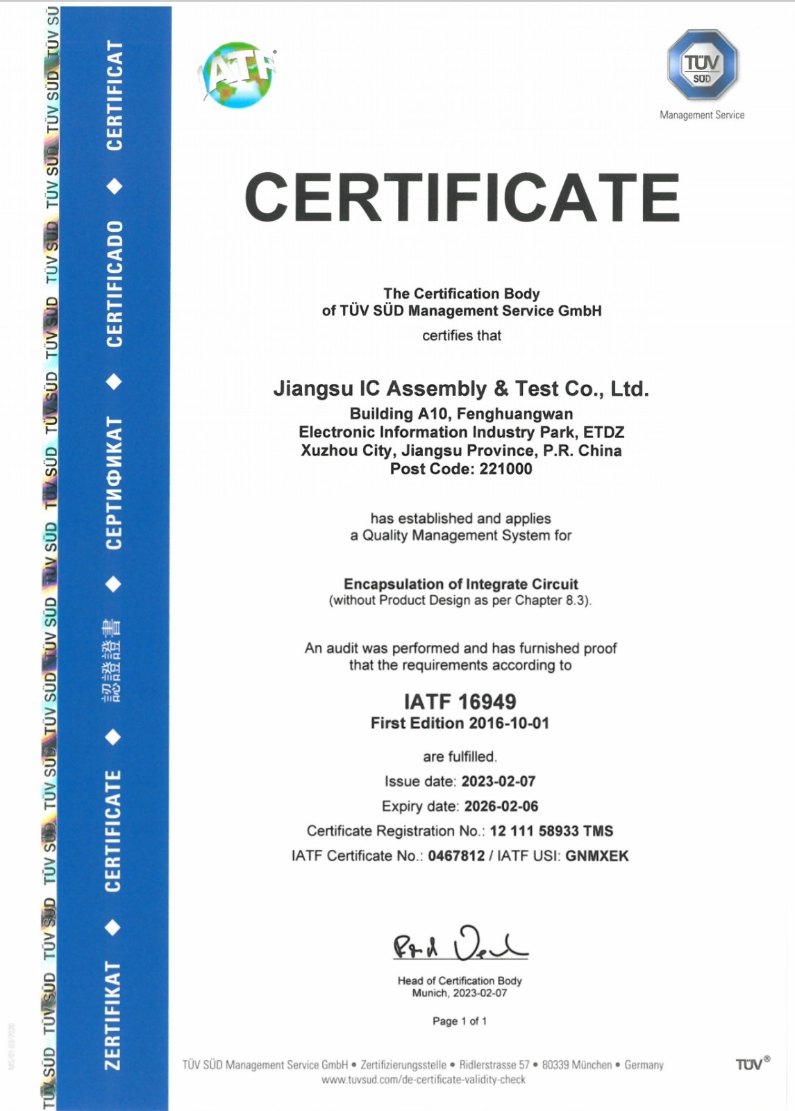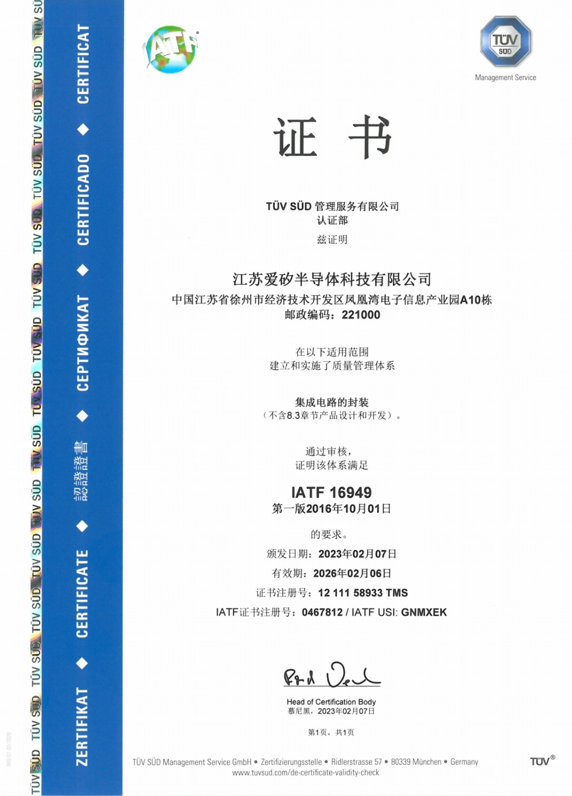 愛矽科技順利通過TUV南德IATF16949質量管理體系認證審核,并獲得認證證書。