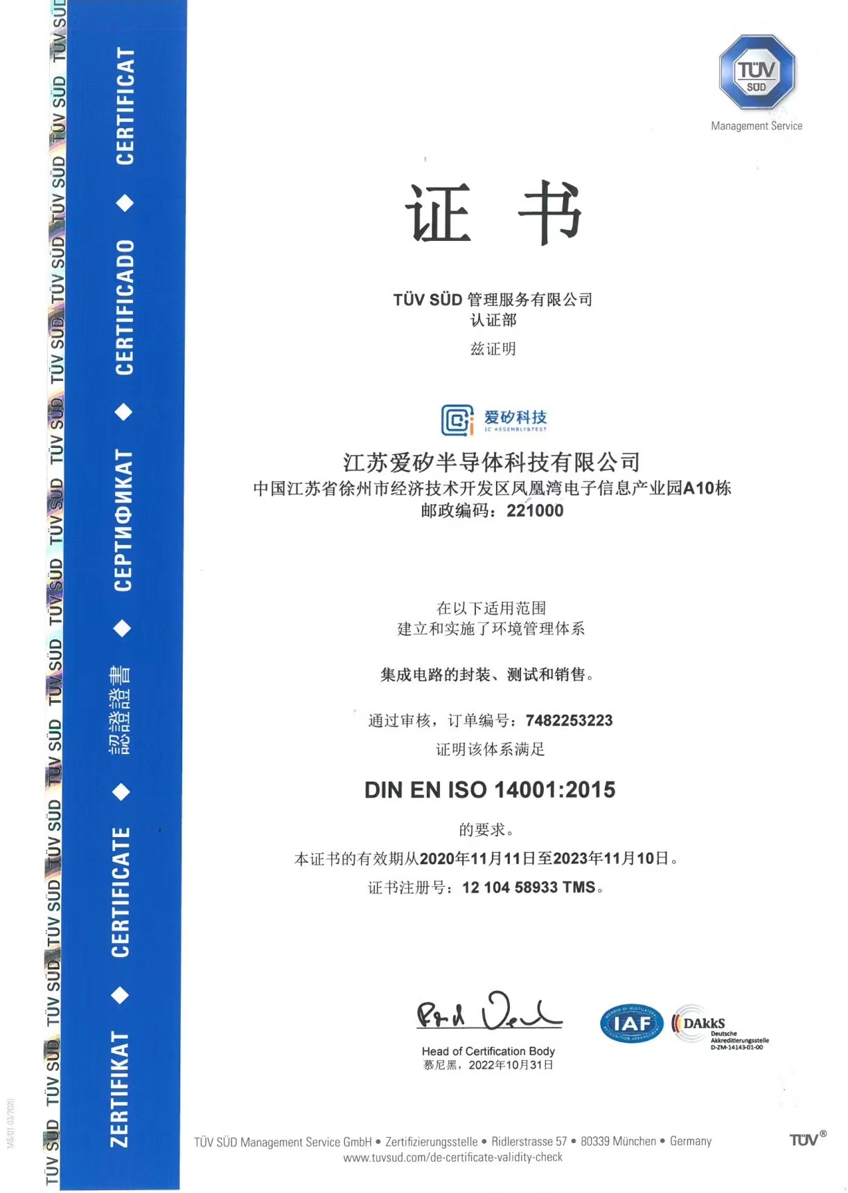 愛矽科技順利通過ISO14001環境管理體系認證審核,并獲得認證證書