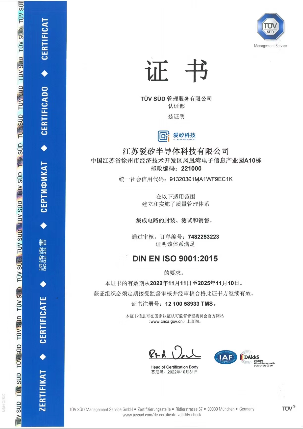愛矽科技順利通過TUV南德ISO9001質量管理體系認證審核,并獲得認證證書